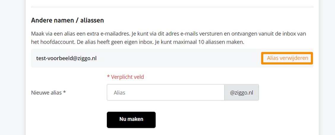 Onder het gedeelte Andere namen / Aliassen kun je nu je alias verwijderen. Klik vervolgens op Alias verwijderen achter het alias dat je wil verwijderen.