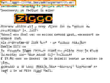 22 Oktober - In de e-mail wordt gesuggereerd dat er een bericht beschikbaar is en moet inloggen met uw Ziggo-ID. Dit is phishing en niet afkomstig van Ziggo.
