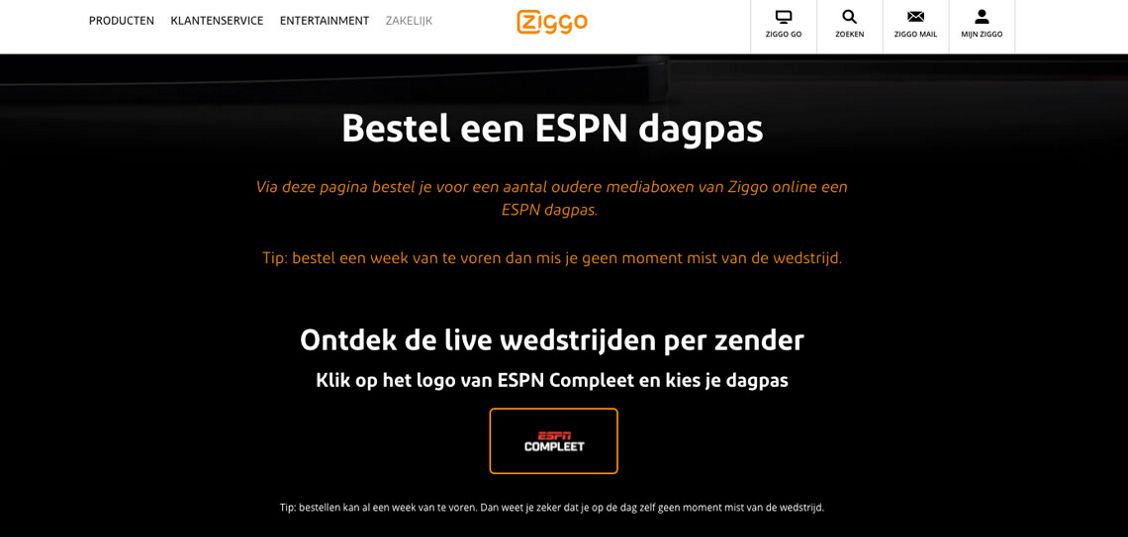 Wil je een ESPN dagpas bestellen? Dan kan dat alleen via je Next, Next Mini en XL mediaboxen. Je kunt dan ook kijken via de Ziggo GO app.