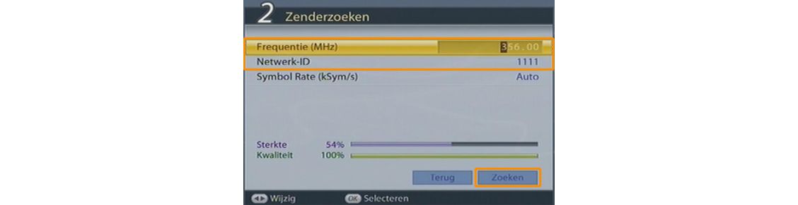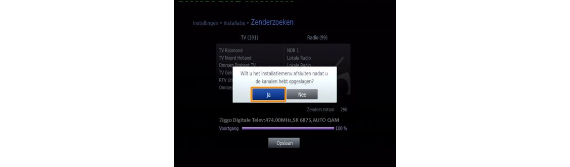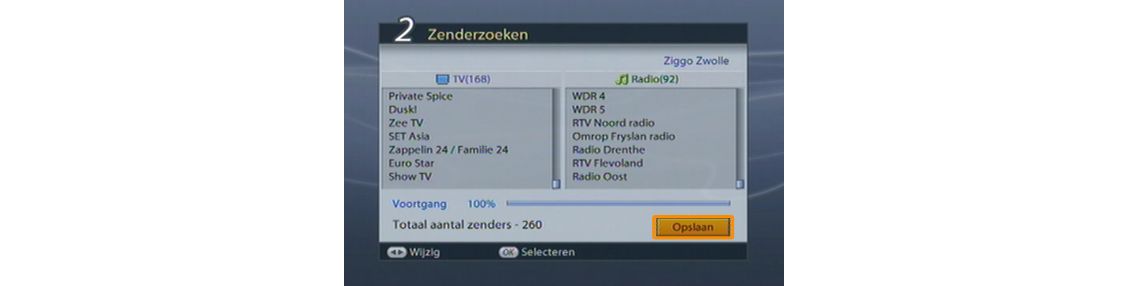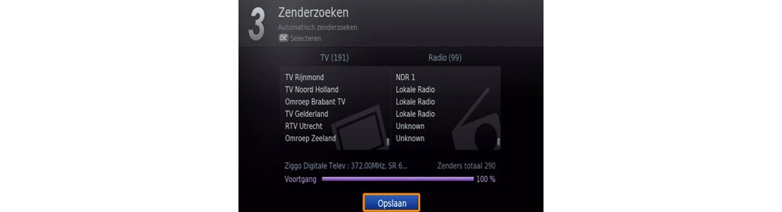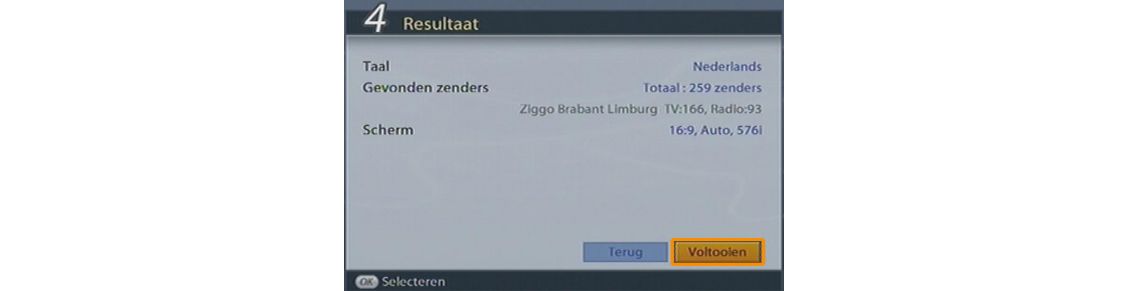 Wacht tot de ontvanger klaar is met zoeken en druk op OK om de zenders op te slaan. Dit kan tot 30 minuten duren.